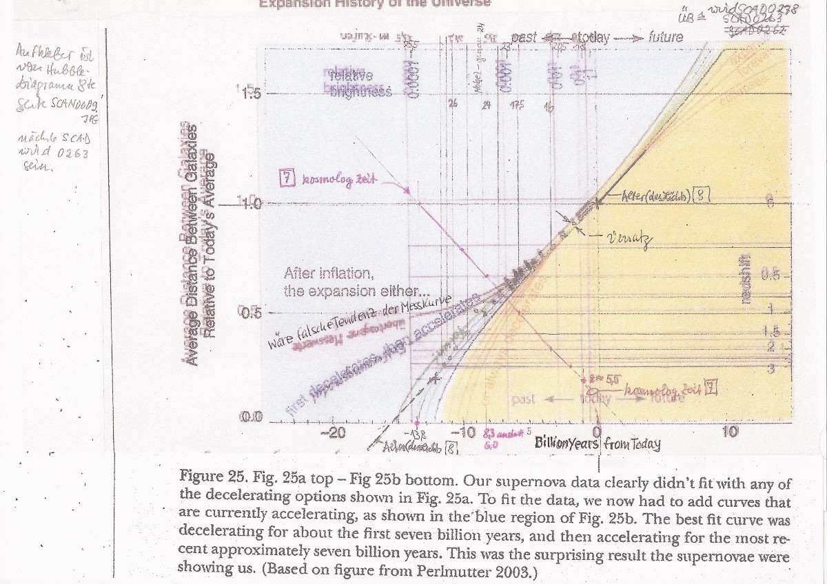 Daraus geht m.E. klipp und klar hervor, dass jene ganz anders gemeinte fragliche Aussage, nämlich, die absoluten SNIa-Mess-Ergebnisse, (also der Nobelpreis-Hubble_plot), bewiesen eine (exponentielle) Zunahme "Dunklen Energie" unsinnig ist.